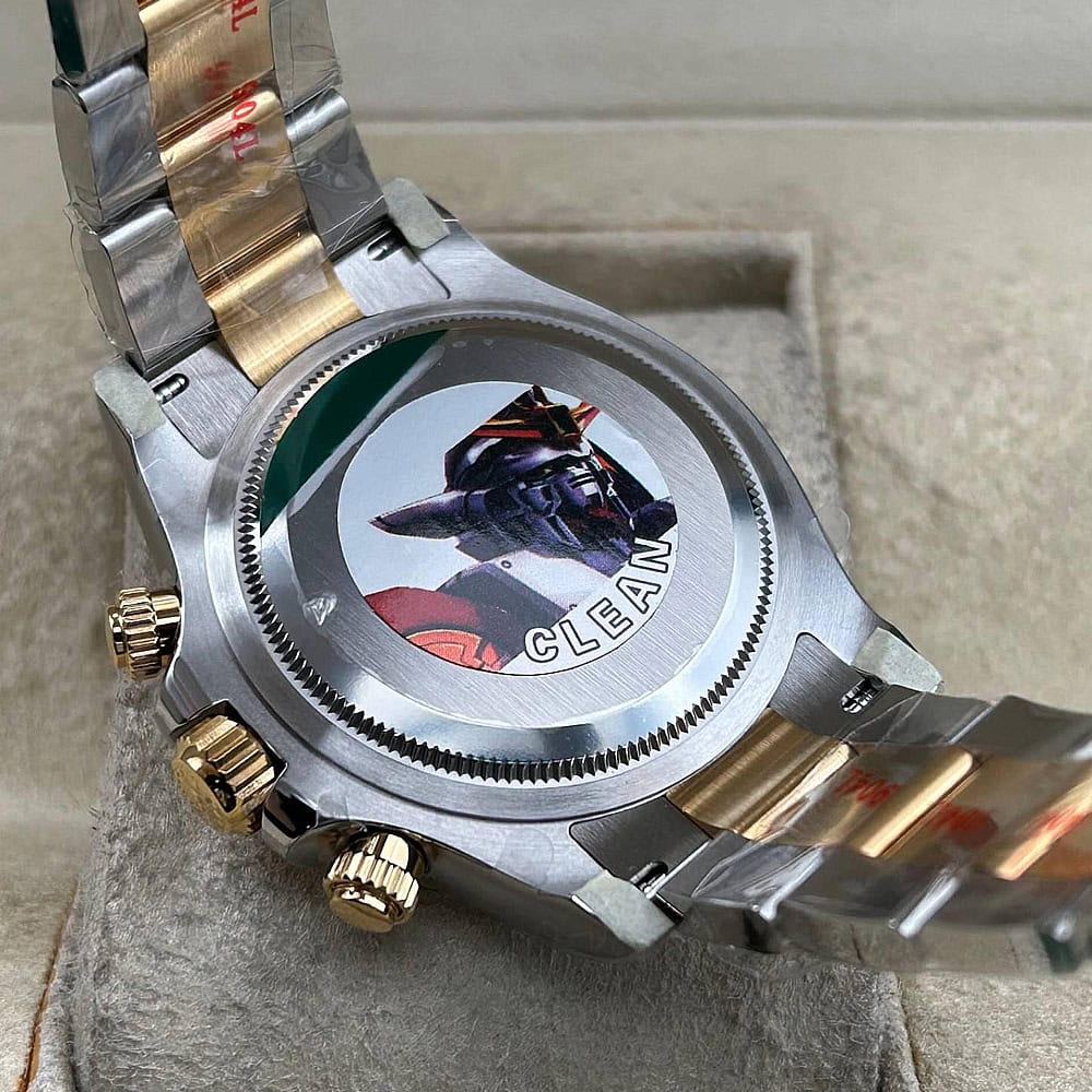 ケース:クリーンファクトリーは40ミリケースを備えており、18Kイエローゴールド加工を施されたソリッド904Lステンレススチールは本物ロレックススチールのモノブロック構造に似ています。スクリュー式ケースバックとプッシュボタン、巻き上げリューズは合成ラバーで密封されており、時計の防水性を確保しています。時計のRehautリンクには‘ROLEXROLEXレザー刻印があり、DLCスクラッチプロティングコーティングを施されております。すべての寸法はロレックス正規品と同一であり、すべての部品をオリジナルと交換できることが保証されています。
