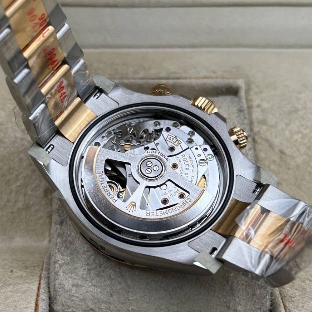 文字盤:文字盤は洗練された黒い背景にモアサナイトダイヤモンドのマーカーを配し、シャンパンカラーのクロノグラフサブダイヤルがアクセントとなっています。アワーマーカーと針はスーパールミノバブルールミネッセンス蓄光塗料でコーティングされており、夜間に9時間まで均一に明るく発光できます。 これにより、ロレックス正規品と同じく、レーザーによる高精度のテキスト、プリント、刻印と相まって、高い可読性が保証されています。 更に、アワーマーカーと針には18kイエローゴールドコーティングを施されたため、色落としません。 同時に、時計の高級感も高めています。