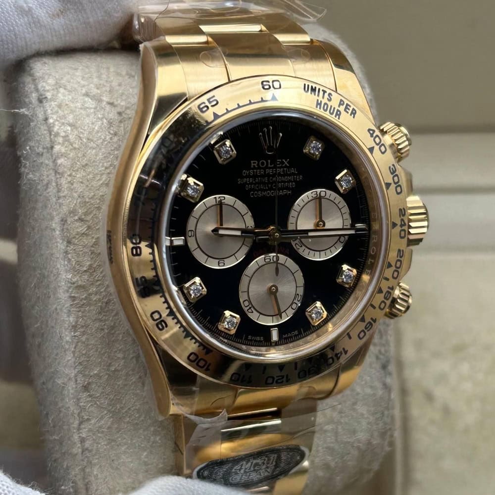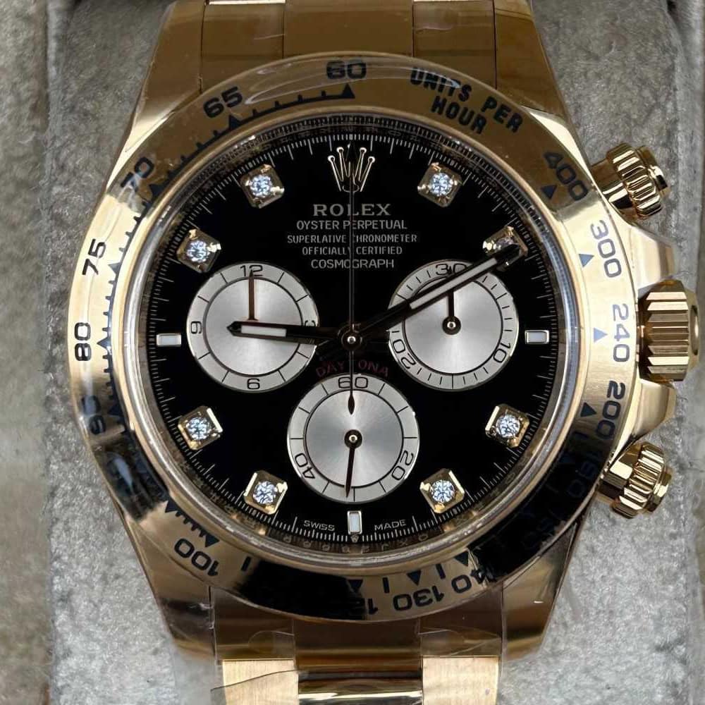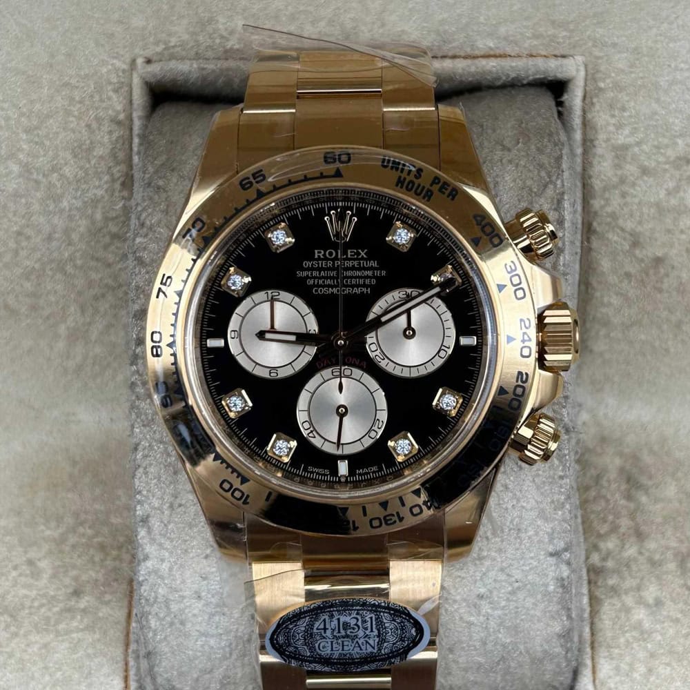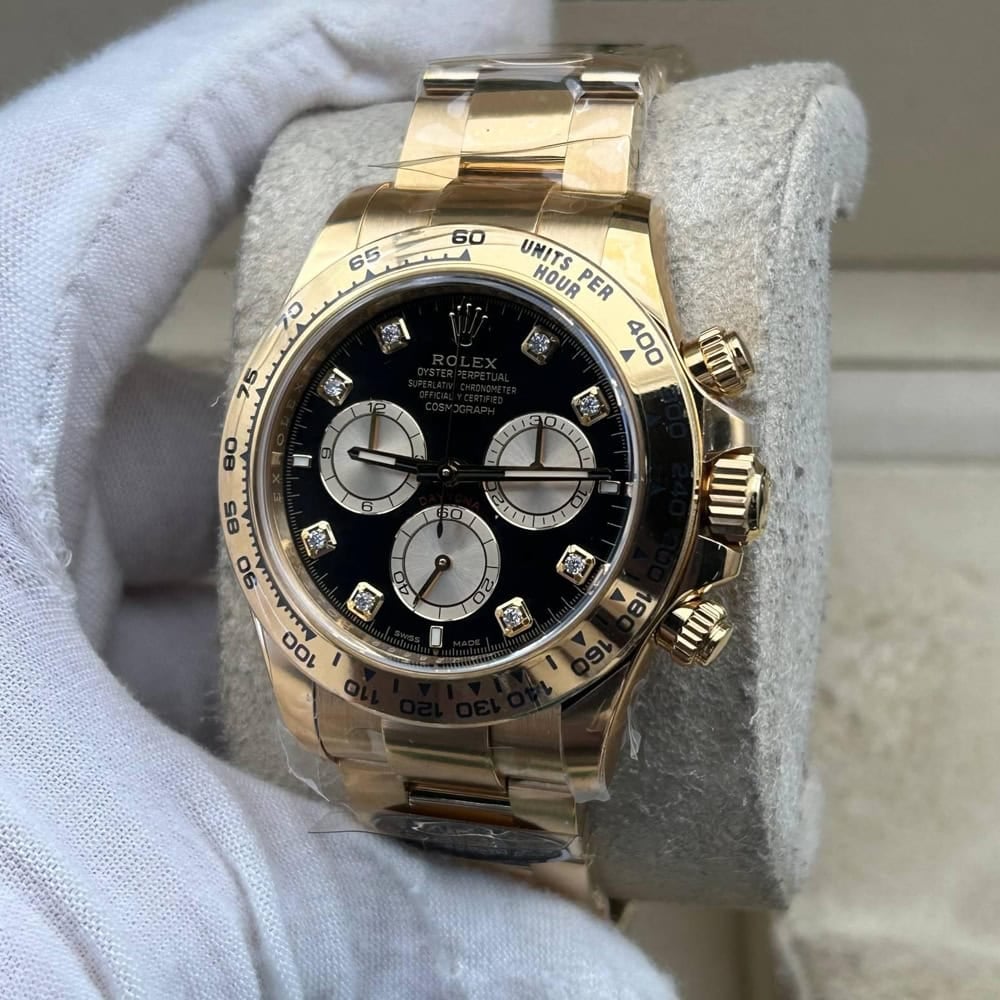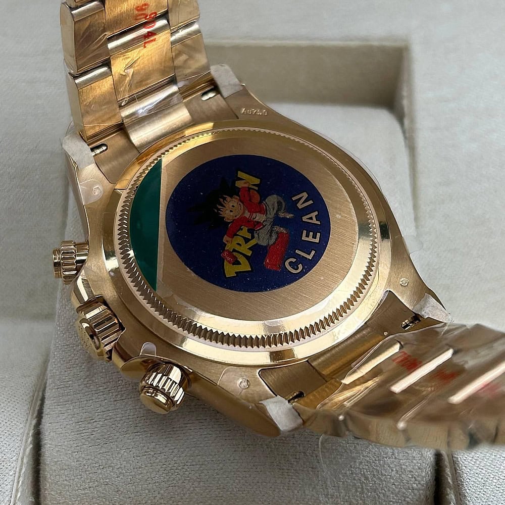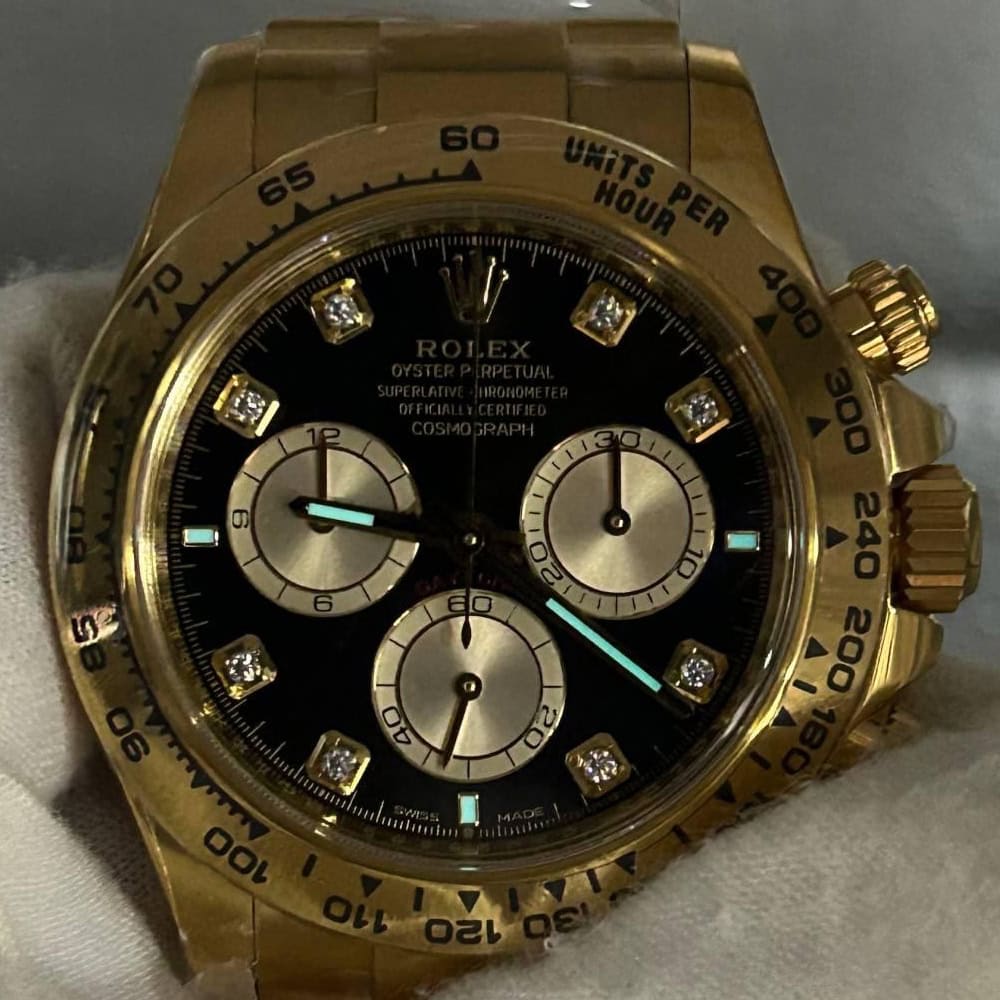 文字盤:文字盤は洗練された黒い背景にモアサナイトダイヤモンドのマーカーを配し、シャンパンカラーのクロノグラフサブダイヤルがアクセントとなっています。アワーマーカーと針はスーパールミノバブルールミネッセンス蓄光塗料でコーティングされており、夜間に9時間まで均一に明るく発光できます。 これにより、ロレックス正規品と同じく、レーザーによる高精度のテキスト、プリント、刻印と相まって、高い可読性が保証されています。 更に、アワーマーカーと針には18kイエローゴールドコーティングを施されたため、色落としません。 同時に、時計の高級感も高めています。