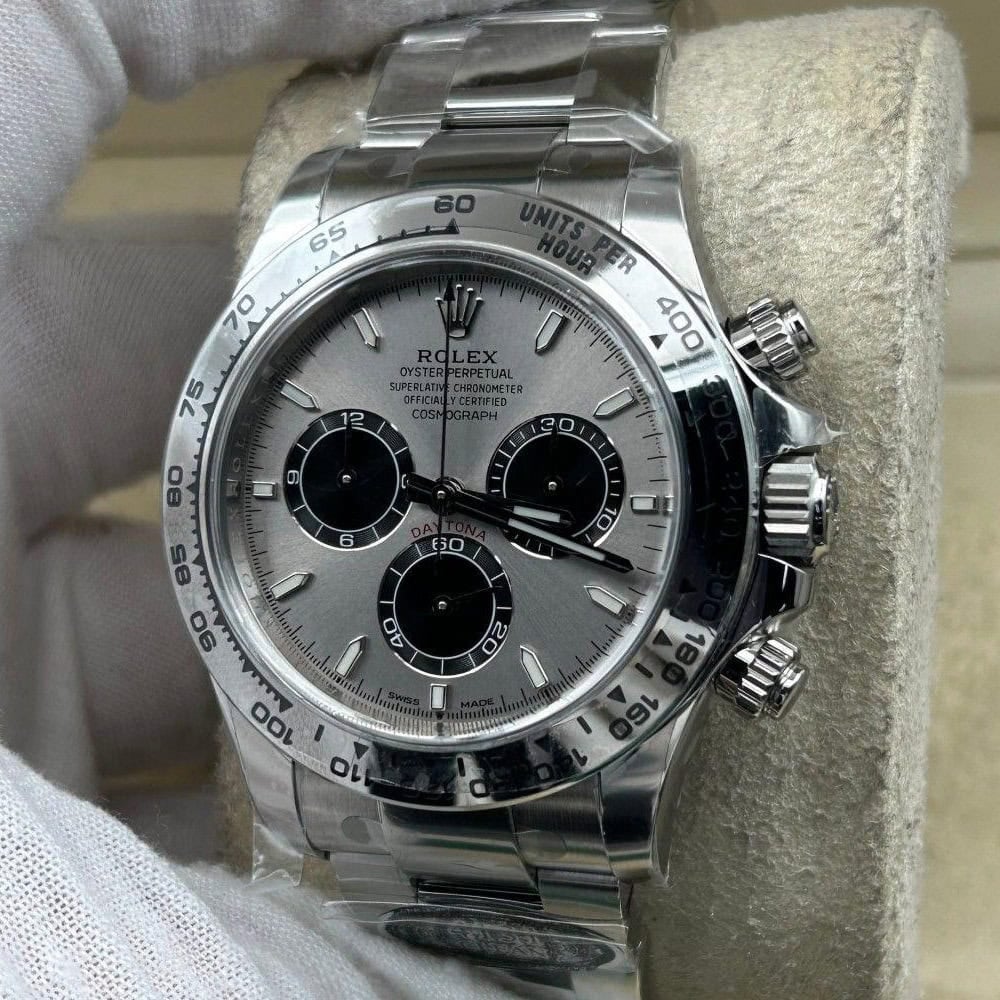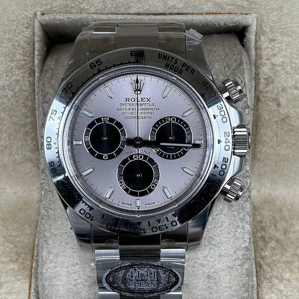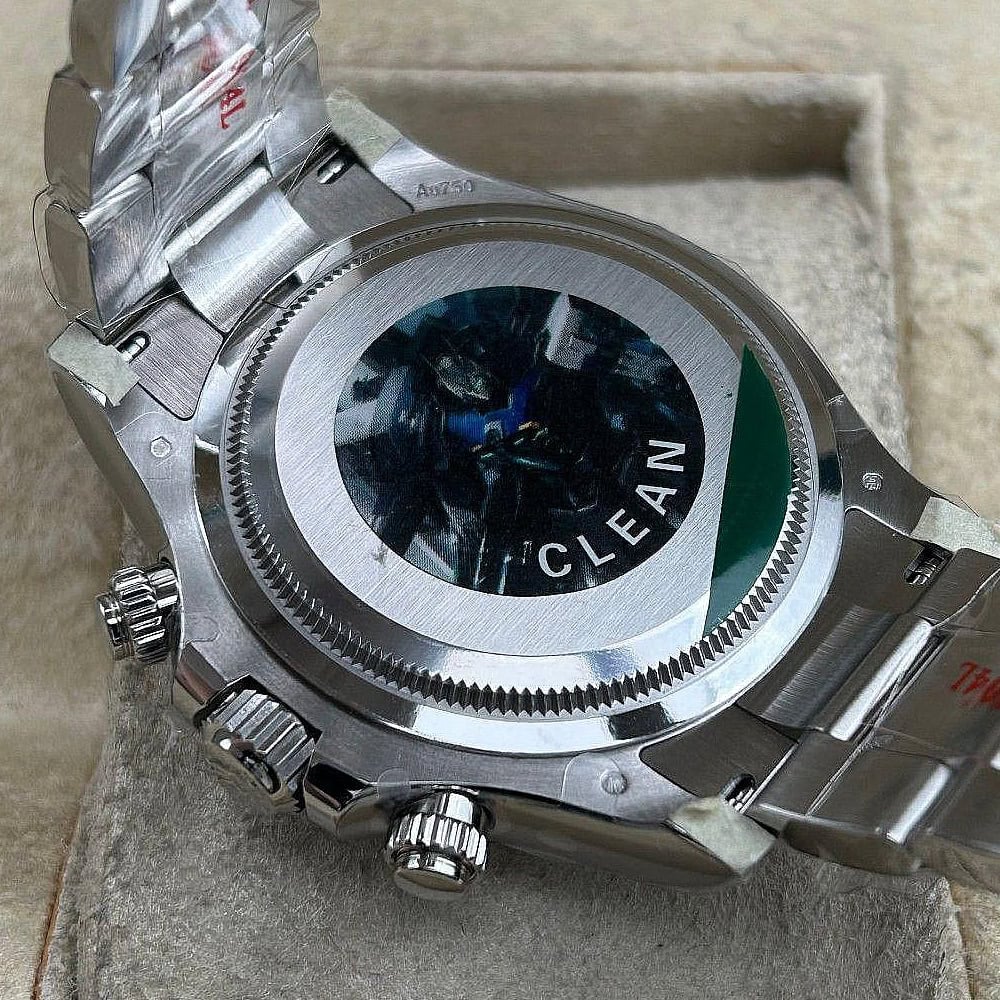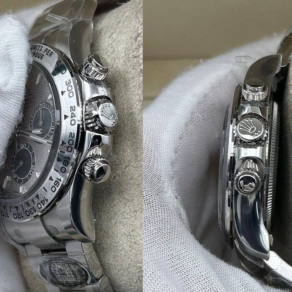 ベゼル:クリーンファクトリーは18Kホワイトゴールドでコーティングされた頑丈な904Lステンレススチール製の固定ベゼルを採用しています。 ベゼルには黒くコーティングされた数字と目盛りが刻まれたタキメータースケールが備わっています。構造とデザインは本物のロレックスと100%一致しています。