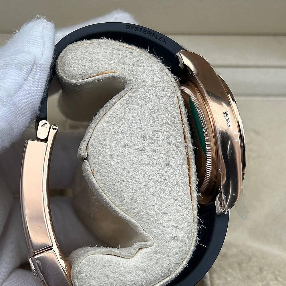 ベルト:メタルブレードの芯にブラックのエラストマーをオーバーモールドされた高性能のラバー製オイスターフレックス?ブレスレットは耐久性と快適性を備えております。ベルトには18kローズゴールドコーティングされたソリッドな904Lステンレススチールによって作り出された折畳式オイスター安全スクラップを備えており、確実なフィット感を確保しております。