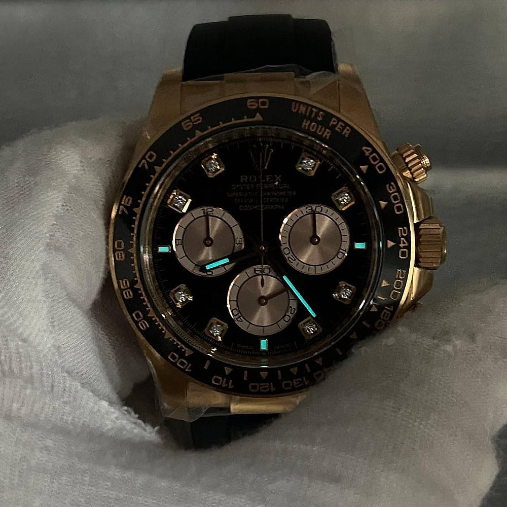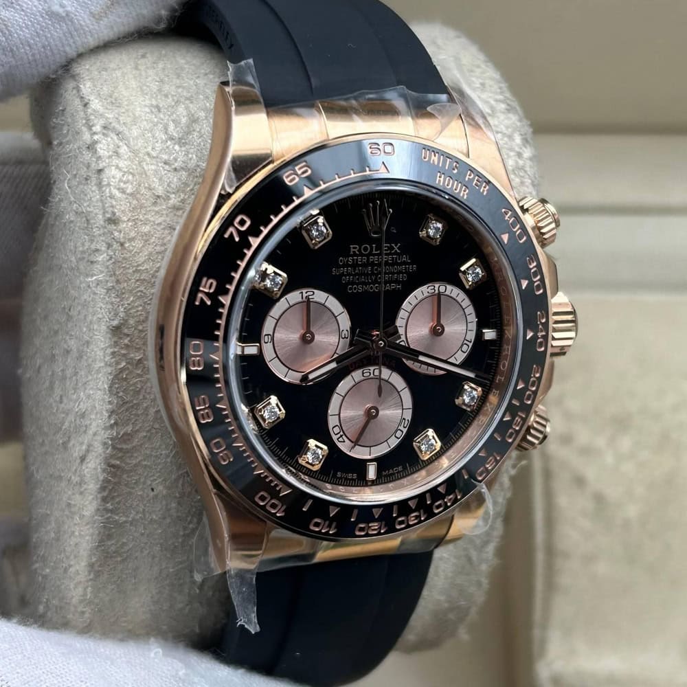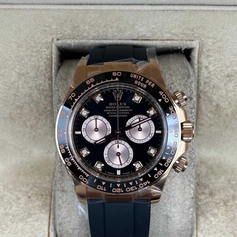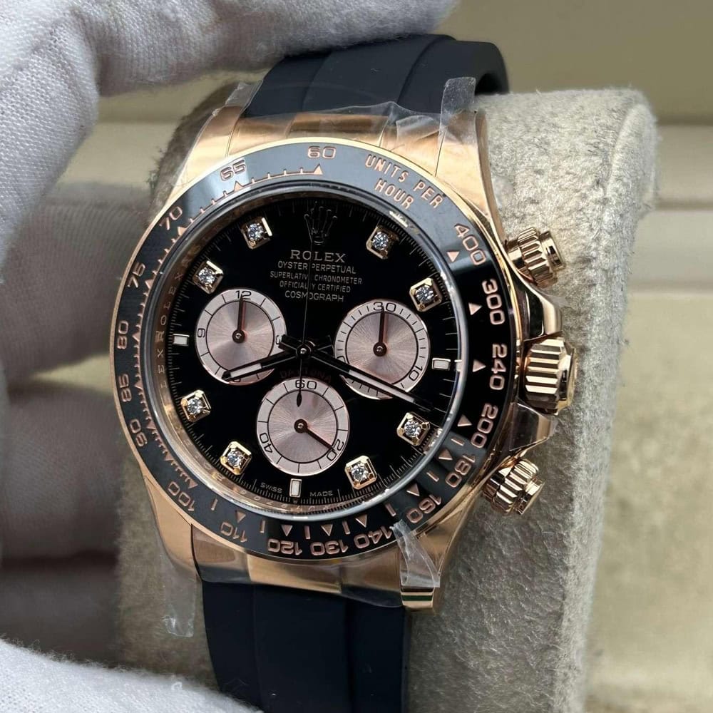 文字盤:ブラック文字盤とローズゴールドのサブダイヤル、モアサナイトダイヤモンドのマーカーが相まって、この時計のエレガンスを引き立てています。アワーマーカーと針にはスーパールミノバブルー蓄光コーティングされており、夜闇に9時間ぐらい視認性を確保できます。 クリーンファクトリーはあらゆるレーザーテキスト、プリント、刻印の精度がロレックス正規品と見分けがつけないことを確保しております。 アワーマーカーと針に施された18Kローズゴールドコーティングは時計の高級感を高めながら、色褪せすることを防止しております。