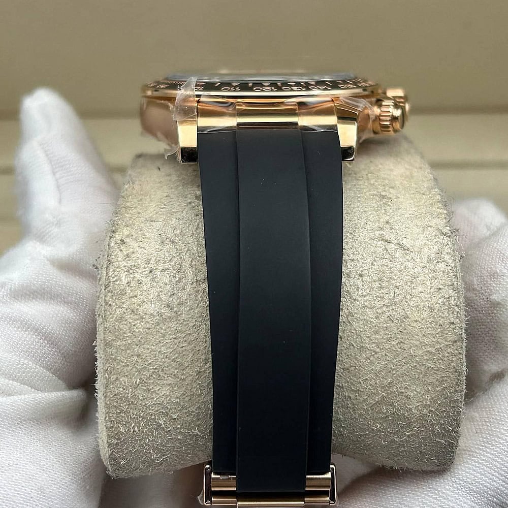ベルト:メタルブレードの芯にブラックのエラストマーをオーバーモールドされた高性能のラバー製オイスターフレックス?ブレスレットは耐久性と快適性を備えております。ベルトには18kローズゴールドコーティングされたソリッドな904Lステンレススチールによって作り出された折畳式オイスター安全スクラップを備えており、確実なフィット感を確保しております。