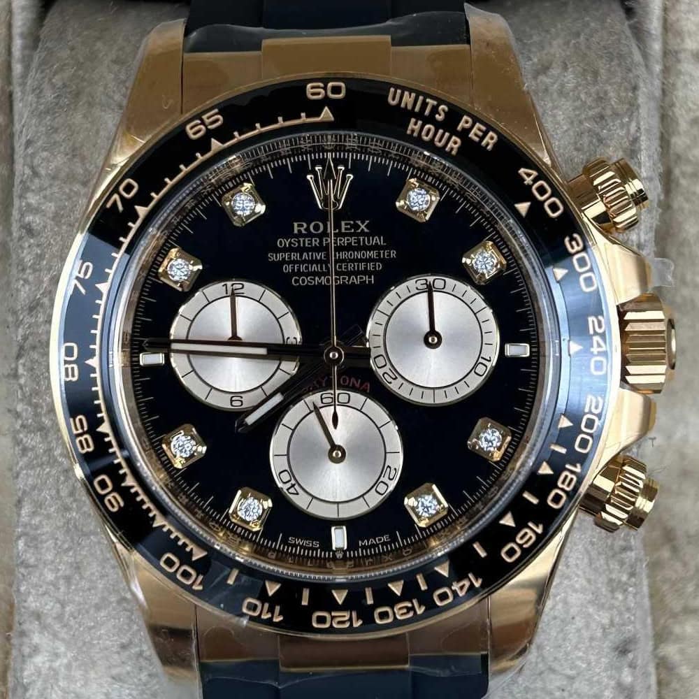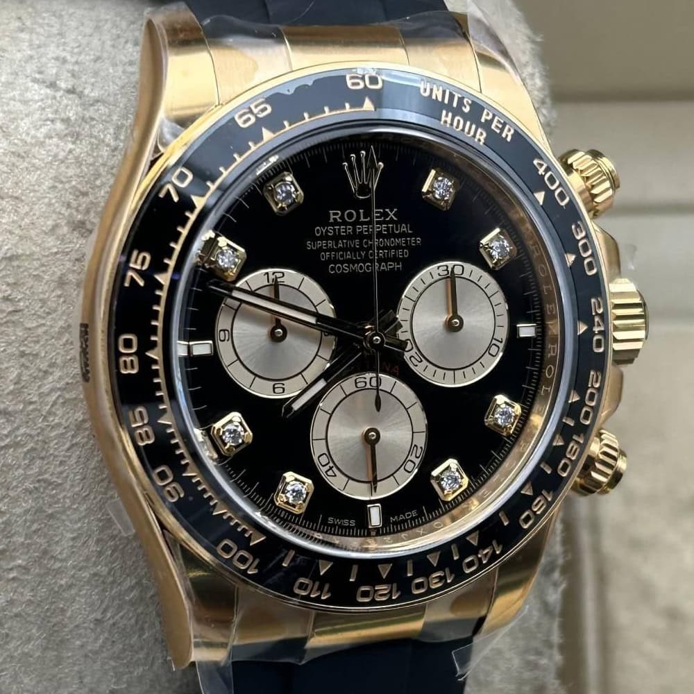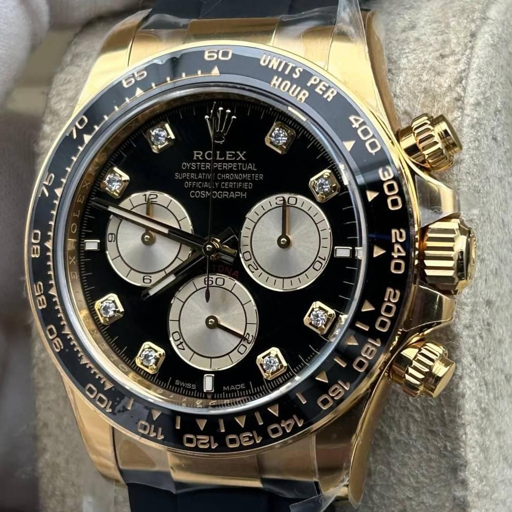 文字盤:ブラック文字盤とゴールデンのサブダイヤル、モアサナイトダイヤモンドのマーカーが相まって、この時計のエレガンスを引き立てています。アワーマーカーと針にはスーパールミノバブルー蓄光コーティングされており、夜闇に9時間ぐらい視認性を確保できます。 クリーンファクトリーはあらゆるレーザーテキスト、プリント、刻印の精度がロレックス正規品と見分けがつけないことを確保しております。 アワーマーカーと針に施された18Kイエローゴールドコーティングは時計の高級感を高めながら、色褪せすることを防止しております。