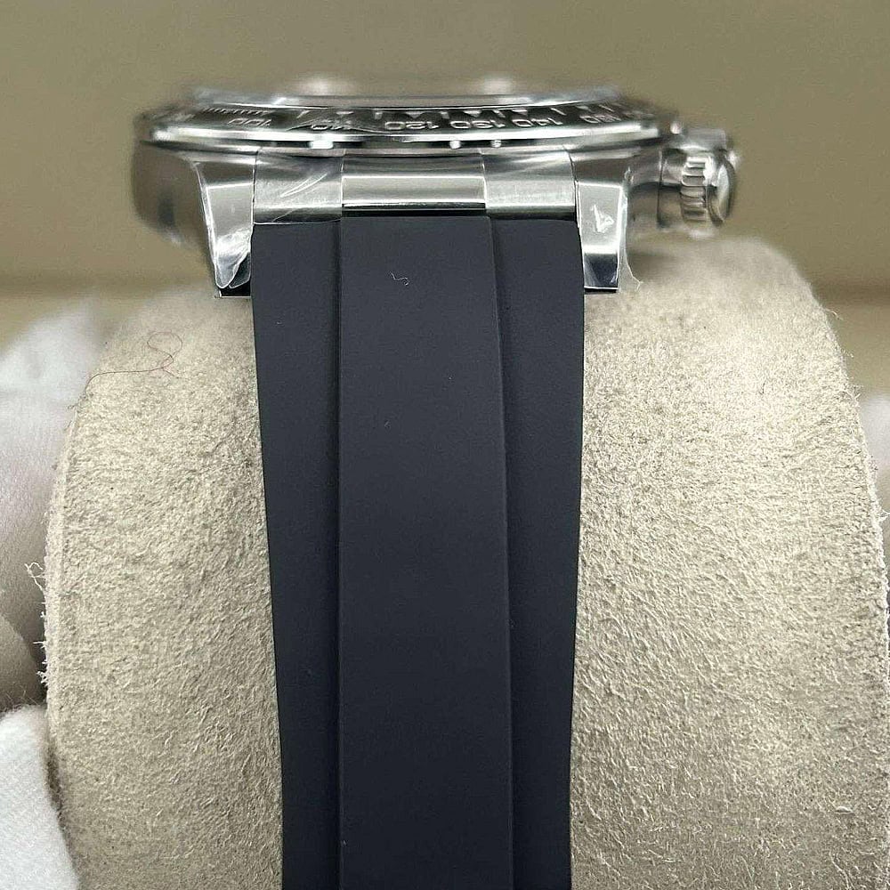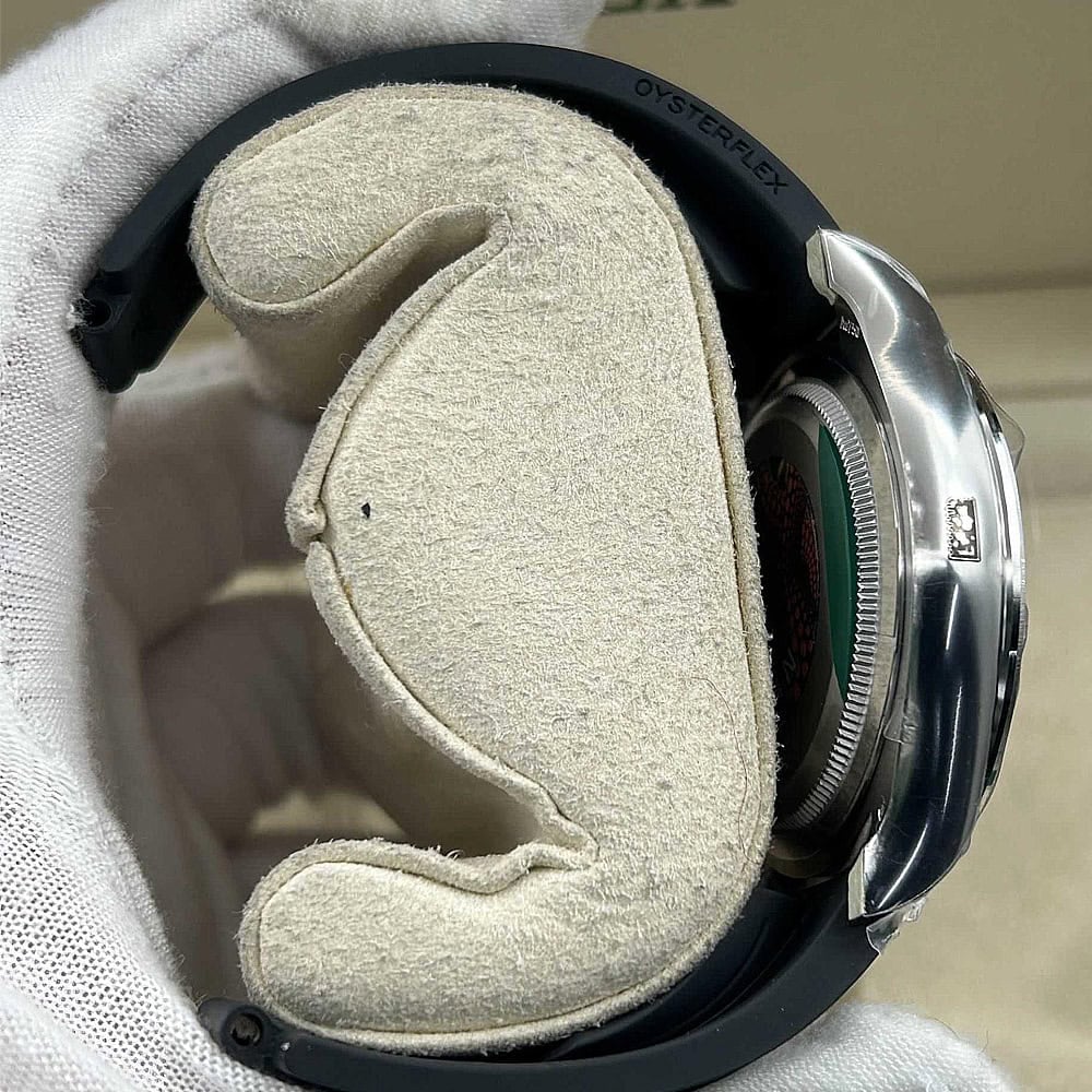 ベゼル:新しいインレーにより、セラミックベゼルは頑丈なワンピースとなり、見た目はよりインレーのように見えます。ベゼルはサファイアガラスとケースと同じ素材で作り出されたボーダーに挟まされています。簡単に言えば、セラクロムベゼルがケース素材の縁取りによってケースに少し入り込んでいるように見えるようになります。ベゼルは色褪せにくい固定式(回りできない)のブラックセラミックで作り出されており、上にはプラチナマッキングが配されております。エリートレベルの精度に設計されており、組成と着色技術はオリジナルのセラクロムセラミック製アウターベゼルと一致しております。